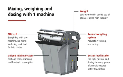 The vertical mixing system ensures an aerated and homogeneous feed mixture. Thanks to the accurate weighing system and the large dosing door, you can also unload very precisely and quickly on both sides of the Sieplo bucket.
